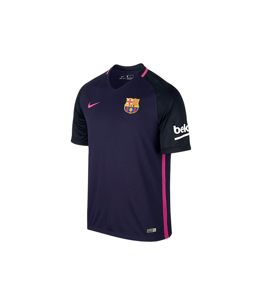 Стильная игровая майка из комплекта формы, с нанесенной символикой Каталонского футбольного клуба Барселона, мужская взрослая модель NIKE FCB AW STADIUM JSY SS 776844-525 SR выполнена в темной сиреневой расцветке с малиновыми элементами, плечи и рукава выполнены из ткани черного цвета. Майка с левой стороны украшена пришитым вымпелом футбольного клуба Барселона, а с правой стороны на груди расположен малиновый логотип производителя. Левый рукав украшает логотип титульного спонсора компании Beko, белого цвета, на правом рукаве нанесена разноцветная эмблема Испанской федерации футбола. Сзади майку украшает логотип Unicef. Модель имеет удобный спортивный крой с короткими рукавами и V-образной горловиной. На затылке вшита полоска ткани желто-красного цвета. При производстве используется современная, качественная ткань, в структуру которой входит волокна полиэстера, что обеспечивает трикотажу повышенную прочность и долговечность. Ткань обладает эластичными качествами, хорошо тянется и возвращается в первоначальное состояние, без деформаций и разрывов. Хорошие вентиляционные качества материала позволяют воздуху проникать вовнутрь футболки, что обеспечивает вентилирование внутреннего пространства. Для большего комфорта в структуру ткани вплетены волокна Dri-FIT, которые с разных концов имеют различную толщину, что обеспечивает отличное впитывание влаги с поверхности тела, отвод ее на наружный слой, где осуществляется испарение. Детали скреплены между собой при помощи качественных швов, которые не рвутся в процессе эксплуатации и обеспечивают изделию длительную эксплуатацию. Майка отлично стирается в автоматическом режиме, не линяет и быстро высыхает, она отлично подойдет для спортсменов, которые занимаются активными, легкоатлетическими видами спорта, ее можно использовать для отдыха или повседневной городской жизни в качестве спортивной одежды.