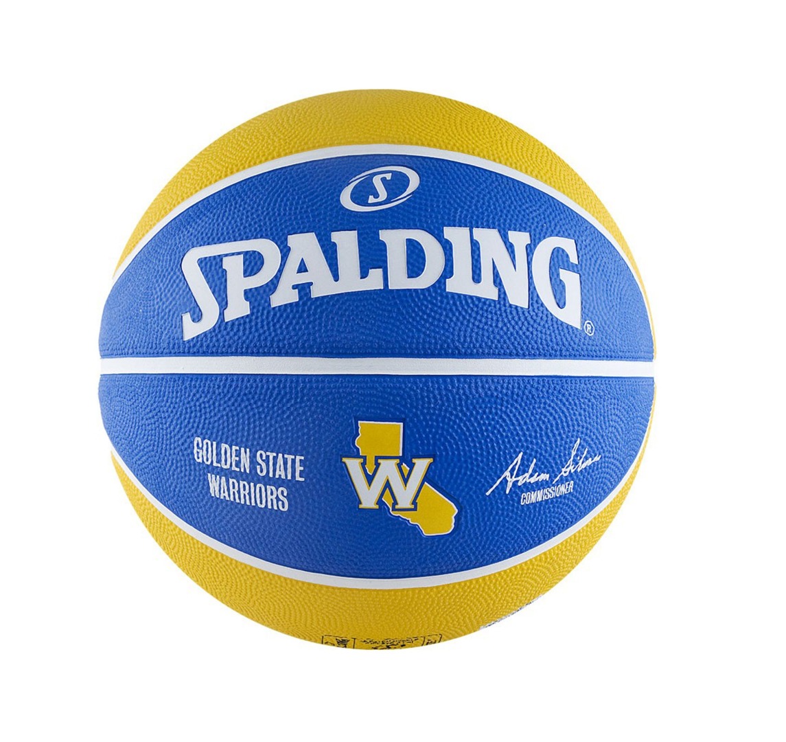 Баскетбольный мяч Spalding, украшенный символикой команды NBA Golden State Warriors, станет отличным выбором для любительских игр на уличных площадках.