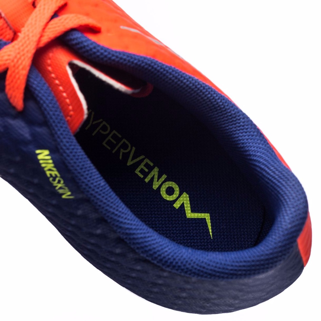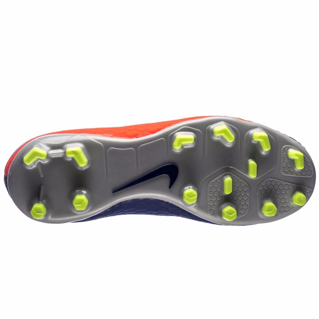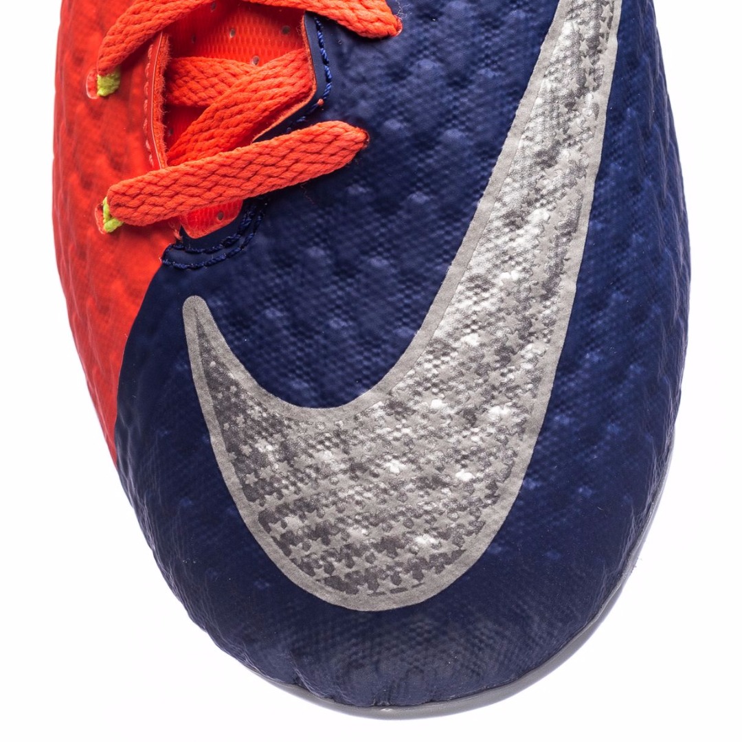 Футбольные бутсы NIKE HYPERVENOM PHELON III FG 852595-409 JR юношеская модель для сухих полей с натуральным, травяным газоном. Бутсы вышли в составе коллекции Time to Shine и получили обновленную расцветку в красных и синих тонах, которую дополняют акценты серебристого и желтого цветов. Материалом верха является синтетический материал с технологией наложения NikeSkin, что делает верх легким и прочным. Анатомический крой создает комфортную посадку, обеспечивая точный охват стопы. Внутренний каркас, созданный прочными кордами, которые объединены с подошвой и линией шнуровки, обеспечивает дополнительную устойчивость и плотно фиксирует стопу, удерживая ее при резких, боковых движениях. Шнуровка смещена от центра и формирует увеличенную область удара. Объемная структура, созданная в верхнем слое, улучшает касание мяча и усиливает тактильные ощущения, позволяя игроку лучше чувствовать и контролировать мяч. Внутренний язычок имеет разделенную в верхней части конструкцию, которая способствует удобному прилеганию к стопе. Перфорированная стелька из формованной пены EVA создает оптимальную амортизацию и комфорт. При изготовлении подошвы используется легкий материал TPU-пластик. Разъединенная конструкция подошвы Split-Toe в области носка повышает гибкость стопы и улучшает сцепление. Шипы плоской и шестигранной конфигурации улучшают сцепление и дают возможность уверенно двигаться на высокой скорости.