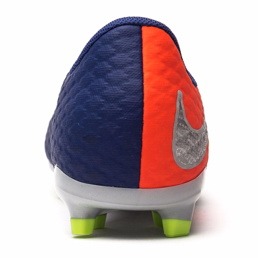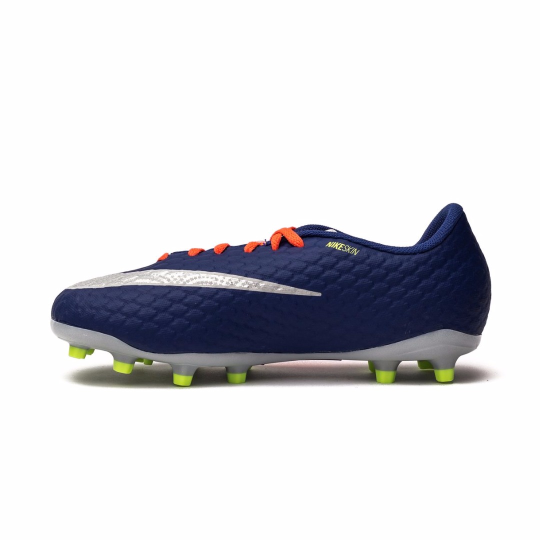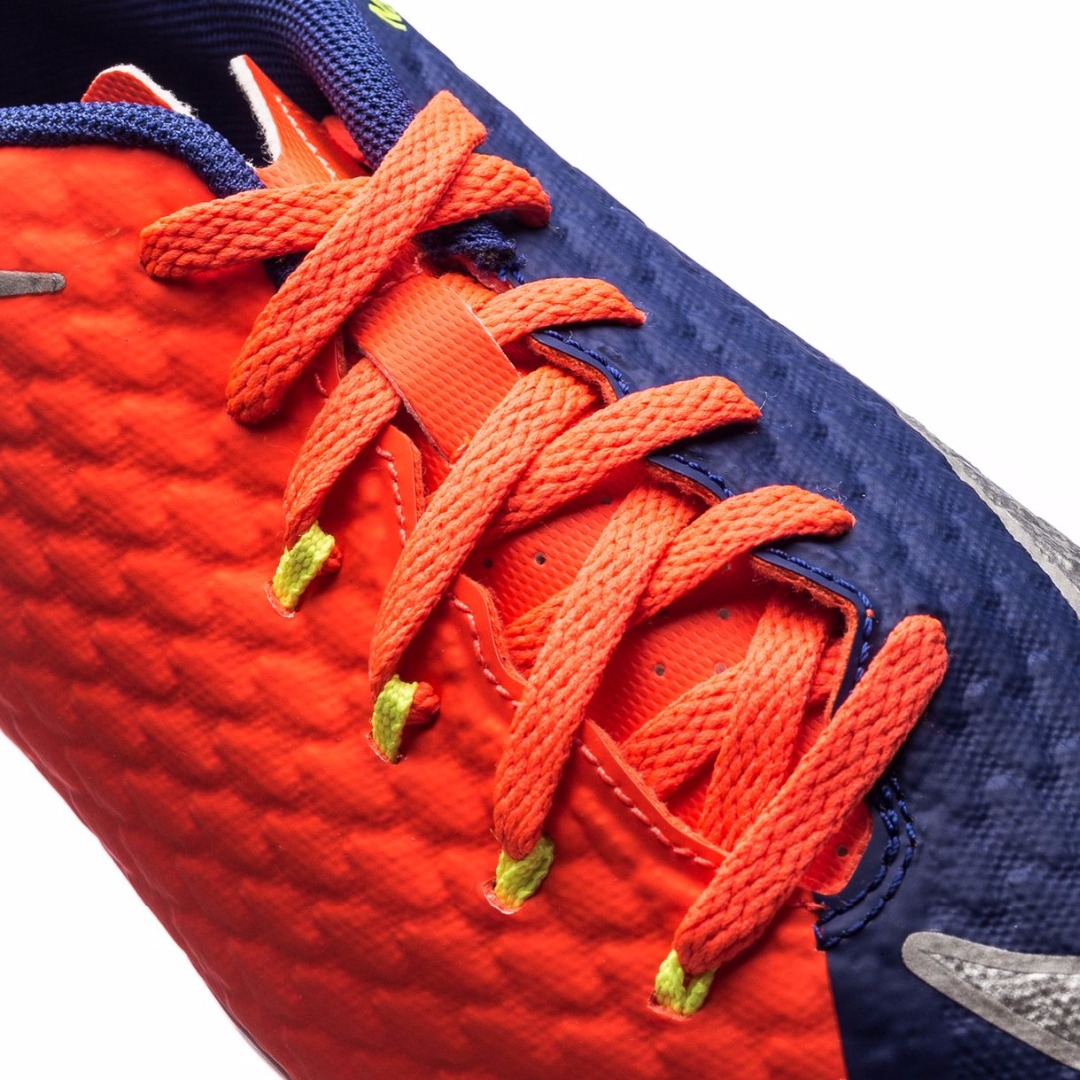 Футбольные бутсы NIKE HYPERVENOM PHELON III FG 852595-409 JR юношеская модель для сухих полей с натуральным, травяным газоном. Бутсы вышли в составе коллекции Time to Shine и получили обновленную расцветку в красных и синих тонах, которую дополняют акценты серебристого и желтого цветов. Материалом верха является синтетический материал с технологией наложения NikeSkin, что делает верх легким и прочным. Анатомический крой создает комфортную посадку, обеспечивая точный охват стопы. Внутренний каркас, созданный прочными кордами, которые объединены с подошвой и линией шнуровки, обеспечивает дополнительную устойчивость и плотно фиксирует стопу, удерживая ее при резких, боковых движениях. Шнуровка смещена от центра и формирует увеличенную область удара. Объемная структура, созданная в верхнем слое, улучшает касание мяча и усиливает тактильные ощущения, позволяя игроку лучше чувствовать и контролировать мяч. Внутренний язычок имеет разделенную в верхней части конструкцию, которая способствует удобному прилеганию к стопе. Перфорированная стелька из формованной пены EVA создает оптимальную амортизацию и комфорт. При изготовлении подошвы используется легкий материал TPU-пластик. Разъединенная конструкция подошвы Split-Toe в области носка повышает гибкость стопы и улучшает сцепление. Шипы плоской и шестигранной конфигурации улучшают сцепление и дают возможность уверенно двигаться на высокой скорости.