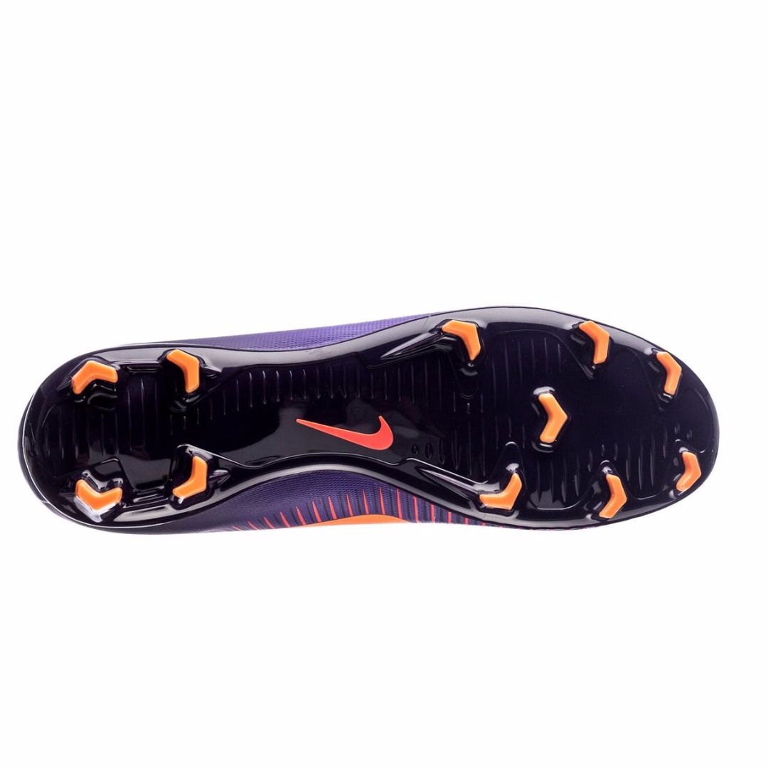 Футбольные бутсы NIKE MERCURIAL SUPERFLY V FG артикул номер 831943-585 JR юношеская модель профессионального уровня для сухих полей с травяным, натуральным газоном. Как и взрослая версия, данная модель получила новую расцветку в рамках последнего цветового обновления FloodLight Pack, в котором используются интересные принты, нанесенные на темную основу. Верх цельной, анатомической конструкции Tongue Less не имеет внутреннего язычка, что позволяет создать более плотную посадку, уменьшить наложение слоев, улучшить ощущение мяча. Бесшовная технология Flyknit, по которой производится верх бутс, и синтетический материал NikeSkin, так же используемый при изготовлении верха, гарантируют отличный контакт с мячом, более точное и естественное касание при дриблинге, проходах и передачах на высокой скорости. Интегрированные в верхний слой нити Flywire, идущие от подошвы к шнуровке, удерживают стопу, прижимая ее к подошве. Это позволяет обеспечить оптимальную фиксацию стопы внутри бутсы, которая необходима для резких поворотов и при движении в высоком темпе. Верхний слой имеет ребристую структуру, нанесенную по технологии Speed Rib, которая призвана повысить качество контроля мяча, усилить его ощущения. Материал верха проходит дополнительную обработку по технологии All Conditions Control, что обеспечивает одинаково высокое качество работы с мячом не зависимо от погодных условий. Завышенный силуэт бутс формирует динамический воротник Dynamic Fit Collar, который плотно фиксирует стопу, исключая любое ее смещение внутри бутсы. Легкая, слегка изогнутая подошва с однослойным, нейлоновым шасси стала еще легче, отзывчивее и гибче. Разделенная конструкция подошвы Split-Toe в носовой части повышает гибкость стопы, усиливает отталкивание. Идеальное сочетание формы и расположения шипов обеспечивает отличное сцепление при быстрых разворотах и во время ускорения, позволяя игроку легко набирать скорость, изменять направление движения, разворачиваться и тормозить.