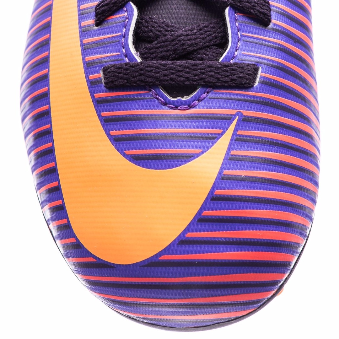Детские футбольные бутсы Nike Junior Mercurial Vortex Iii Fg с верхом из синтетической кожи с рифлеными накладками и подошвой из материала ТПУ обеспечивают отличное касание и уверенное сцепление для современной скоростной игры. Геометрические шипы легко входят в покрытие и выходят из него, не препятствуя ускорению.