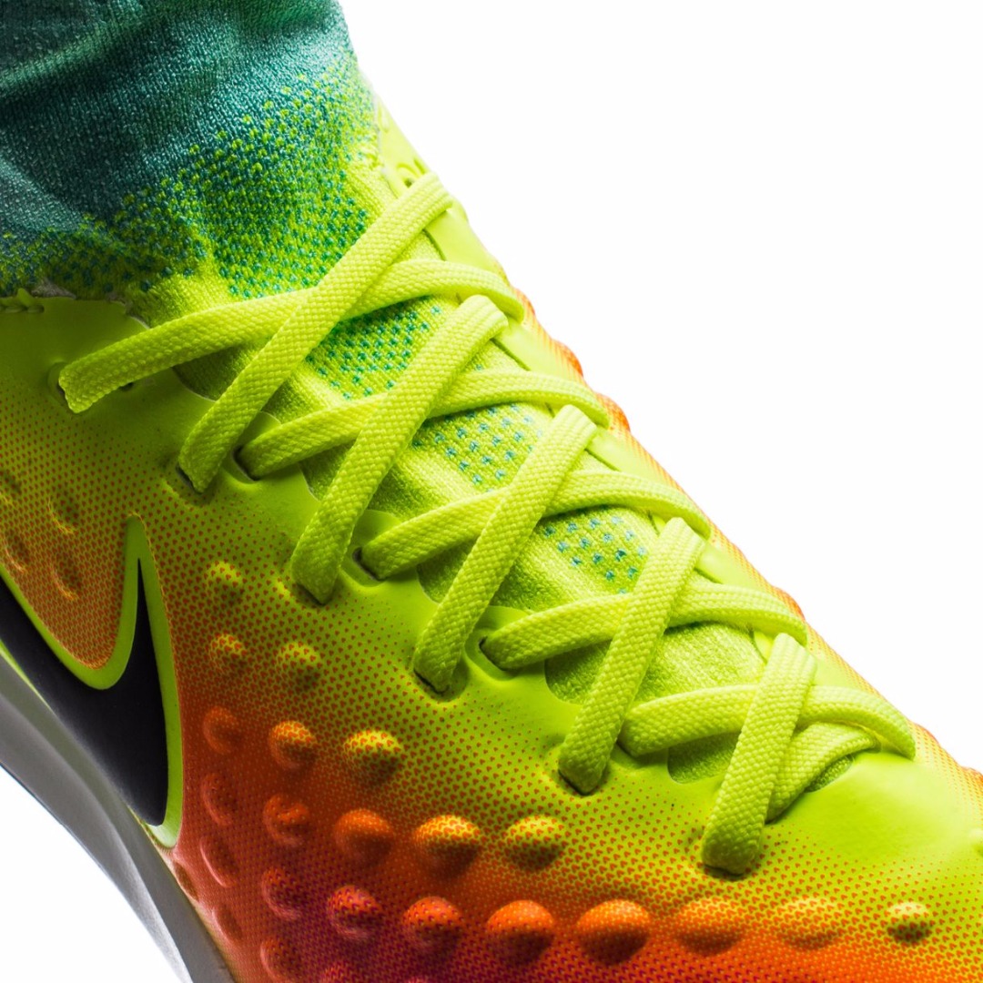 Игровая обувь NIKE MAGISTAX PROXIMO II IC 843955-703 JR профессиональная, юношеская модель для зала второго поколения. Пестрый окрас этой модели посвящен бразильским мотивам, так как вся обновленная линейка Magista второго поколения создана в преддверии Олимпийских игр 2016 в Рио. Качественная, синтетическая кожа, используемая при производстве верха этой модели, обладает податливостью и эластичностью, точно повторяя все контуры стопы, создавая мягкую, адаптивную посадку. Переработанный воротник Dynamic Fit Collar получил обновленную форму, которая соответствует естественным контурам лодыжек, создавая плотную посадку и дополнительную защиту. Для лучшего ощущения мяча при касании, поверхность игровой обуви на латеральной и медиальной сторонах имеет объемные, текстурированные зоны, усиливающие тактильные ощущения. Промежуточная подошва, выполненная из легкого, вспененного материала, гасит удар, эффективно поглощая его энергию в момент контакта пятки с опорной поверхностью. Твердая резина, используемая в производстве внешней подошвы, обладает высокой стойкостью к истиранию, прочностью, а так же отличным сцеплением благодаря обновленному рисунку протектора. Его круговая форма позволяет игрокам с легкостью менять направление движения.