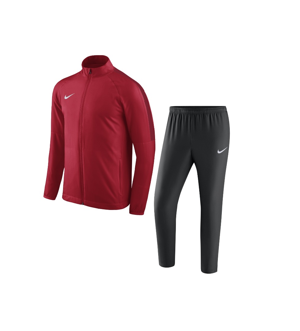 Качественный спортивный костюм для занятий и тренировок, модель для взрослых NIKE DRY ACDMY18 TRK SUIT 893709-657 SR костюм состоит из куртки и брюк. Костюм выполнен в удобном спортивном крое, что обеспечивает комфортную и удобную посадку на теле во время занятий. Куртка костюма имеет яркую красную расцветку и украшена лампасами из материала черного цвета, что обеспечивает спортивный внешний вид. Брюки практичной черной расцветки. На груди куртки с правой стороны и на левой штанине расположены логотипы производителя корпорации Nike в виде галочки белого цвета, которые придают модели фирменный внешний вид. Брюки прочно фиксируются на фигуре при помощи эластичной резинки, которая расположена в верхней части, параллельно с резинкой расположен утягивающий шнурок, который позволяет регулировать посадку. Куртка с длинными рукавами и высоким воротом, который защищает шею от ветра. На фронтальной стороне имеется удобная полноразмерная застежка молния. В верхней части молнии имеется небольшая тканевая защита, которая предохраняет шею от контакта с молнией. На боковых поверхностях куртки имеется пара симметричных карманов, для хранения спортивных аксессуаров. Костюм пошит из качественного синтетического материала, в состав которого входят волокна полиэстера, что придает, такни высокую прочность и делает материал износостойким. Хорошие вентиляционные свойства материала обеспечивают благоприятный микроклимат для тела спортсмена во время выполнения различных интенсивных упражнений. Применение технологии Dri-FIT, осуществляет отвод влаги от поверхности тела на наружный слой, обеспечивая сухость и комфортные условия. Данная модель не прихотлива в эксплуатации, она отлично стирается в холодной воде. Ткань не выгорает и не линяет под действием лучей ультрафиолета. Костюм можно использовать для активных легкоатлетических видов спорта, в нем можно заниматься футболом, или использовать в качестве одежды спортивного стиля для отдыха на природе.