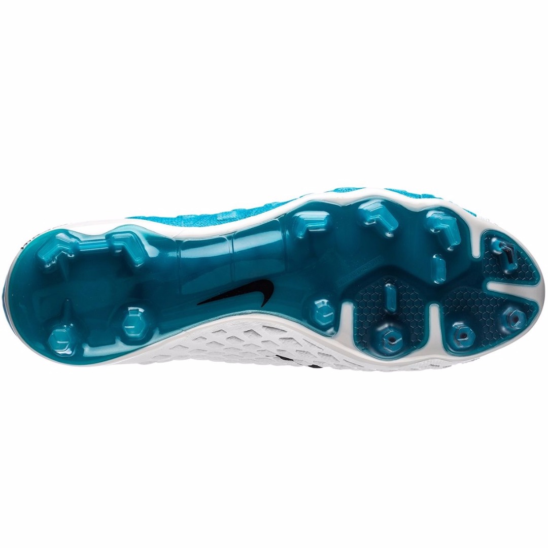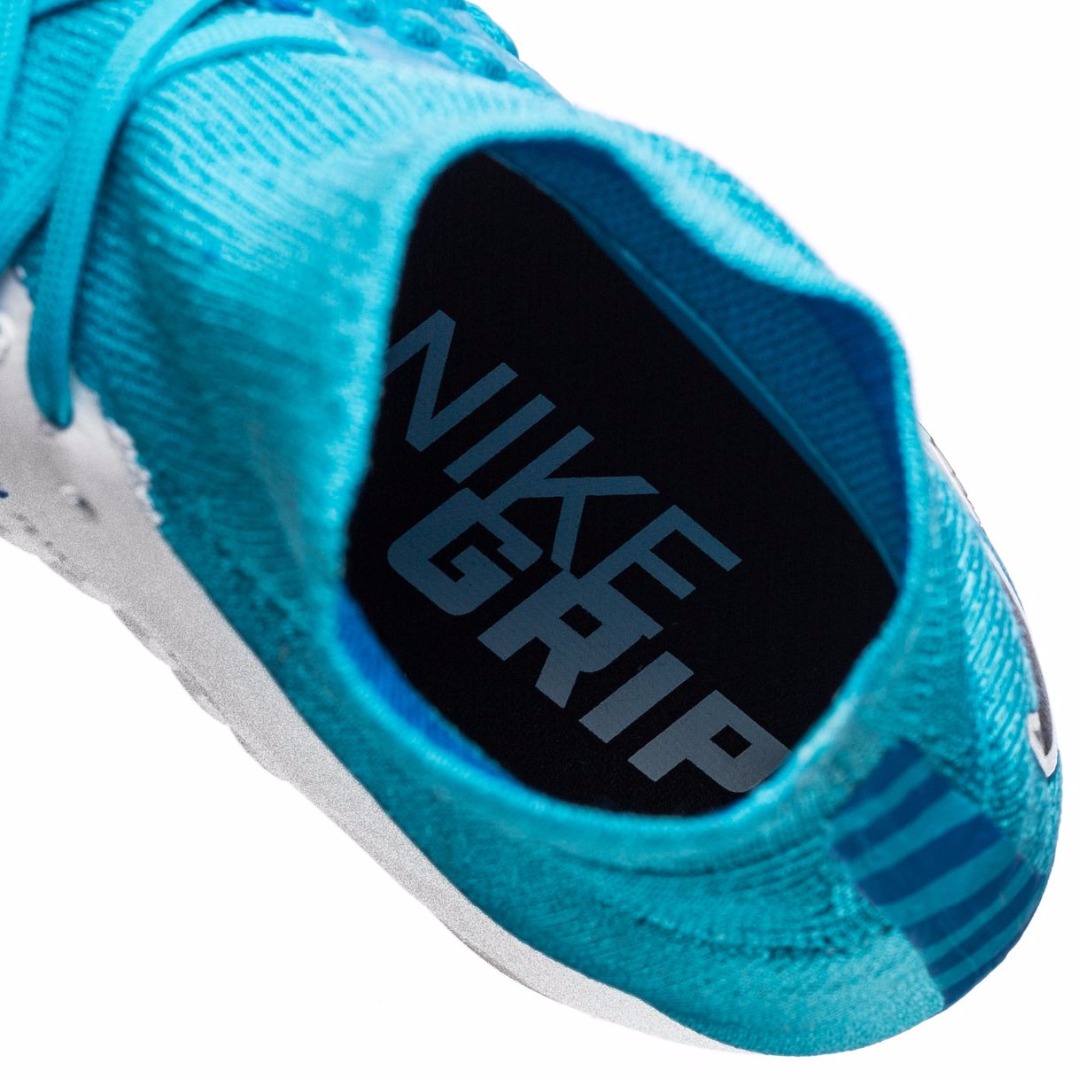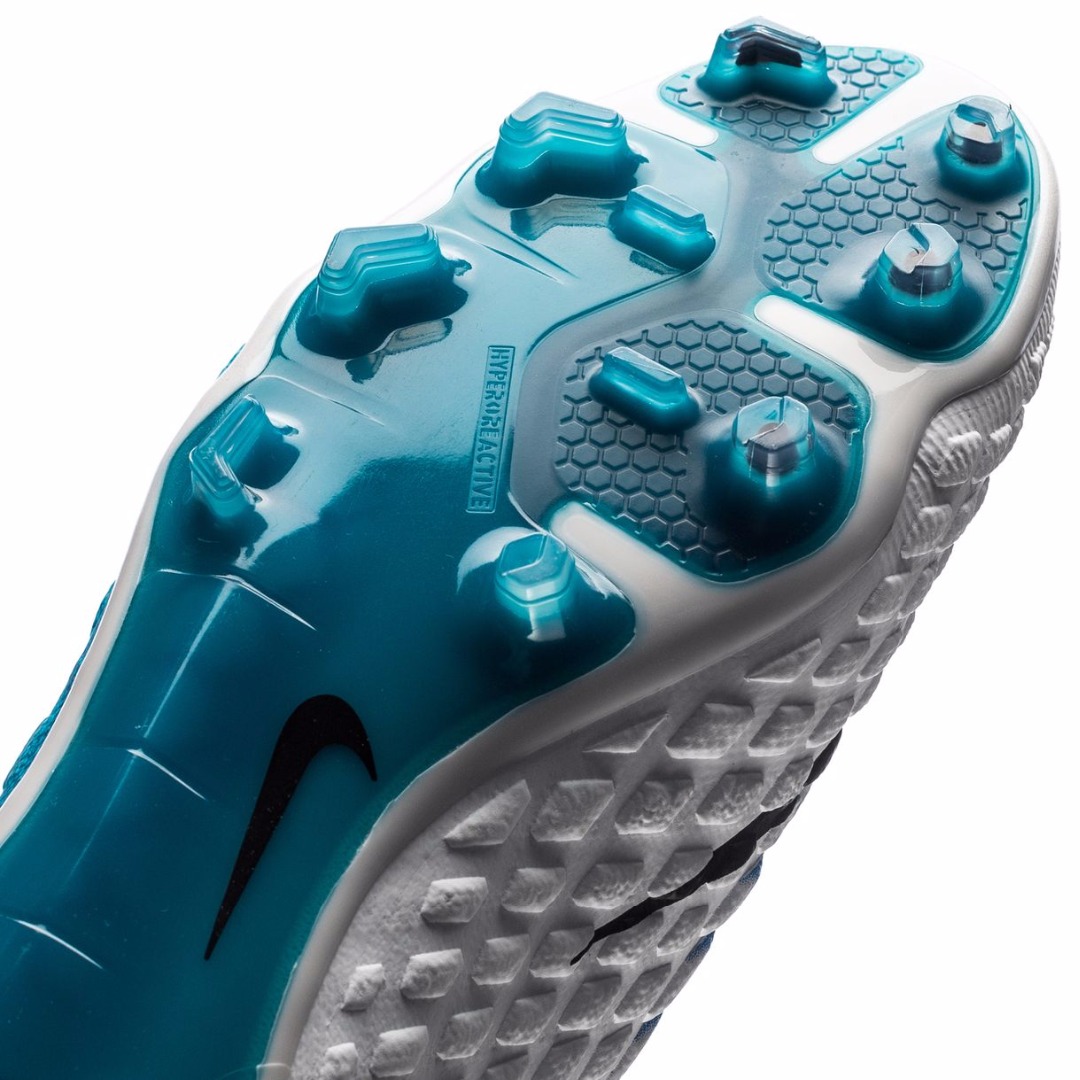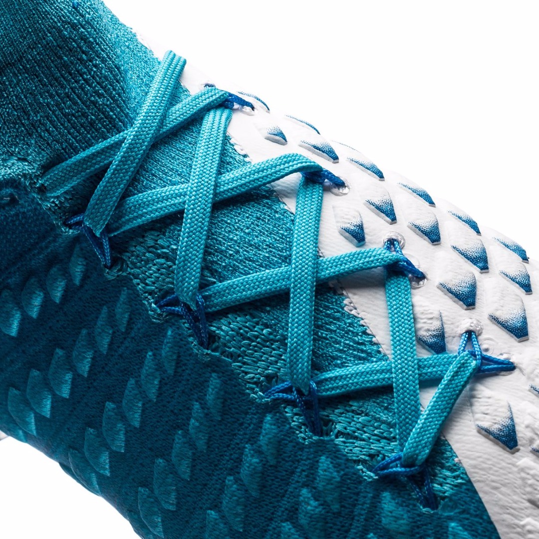 Профессиональные, футбольные бутсы NIKE HYPERVENOM PHANTOM III DF FG 860643-104 SR для полей с сухим, натуральным газоном. Бутсы получили новое цветовое оформление в рамках последней коллекции Motion Blur Pack, которую совсем недавно представил спортивный гигант. Верх этой модели представлен в сочетании голубого и белого цветов с элементами черного цвета. Верх не имеет швов и стыкующих элементов, его цельная конструкция создает удобную и плотную посадку на ноге. Максимально тесный контакт ноги с мячом достигается за счет отсутствия внутреннего язычка в конструкции верха. При изготовлении верха используется легкое и прочное полиэфирное волокно, связанное по технологии Flyknit, за счет чего снижается вес бутс, обеспечивается отличная воздухопроницаемость и прочность. За счет различной плотности плетения нитей создаются зоны с великолепной гибкостью и эластичностью, а так же зоны, обеспечивающие поддержку стопы. В материал верха интегрированы сверхпрочные нити Flywire, которые формируют прочный каркас, создающий поддержку стопы и увеличивающий прочность верха. Внутренняя стелька со специальным покрытием Nike Grip фиксирует стопу внутри бутсы, исключая какое-либо ее смещение. Динамический воротник Dynamic Fit Collar обеспечивает эффективную поддержку голеностопного сустава при изменении направления движения. Поверхность бутс обработана в соответствии с технологией All Conditions Control и обеспечивает отличное касание мяча в любых погодных условиях. Для обеспечения наилучших тактильных ощущений при контакте ноги с мячом поверхность бутс получила текстурированную структуру HyperReactive Texture, которая сформирована интегрированной в материал верха пеной Poron. Толщина пены составляет 2 мм. Пена смягчает прием мяча, а при ударе ногой по мячу способствует максимальному возврату энергии, придавая удару больше мощности и силы. Подошва в передней части выполнена из легкого и гибкого материала Pebax для придания стопе гибкости, устойчивости и жесткого нейлона в задней части для создания оптимальной поддержки. Оптимальная форма и расположение шипов создают отличное сцепление на поле.