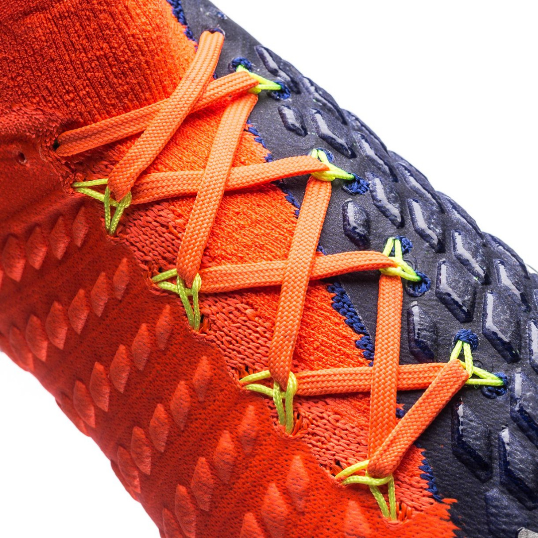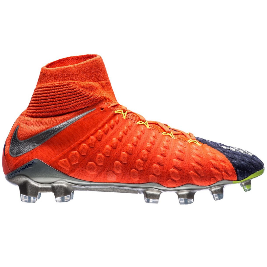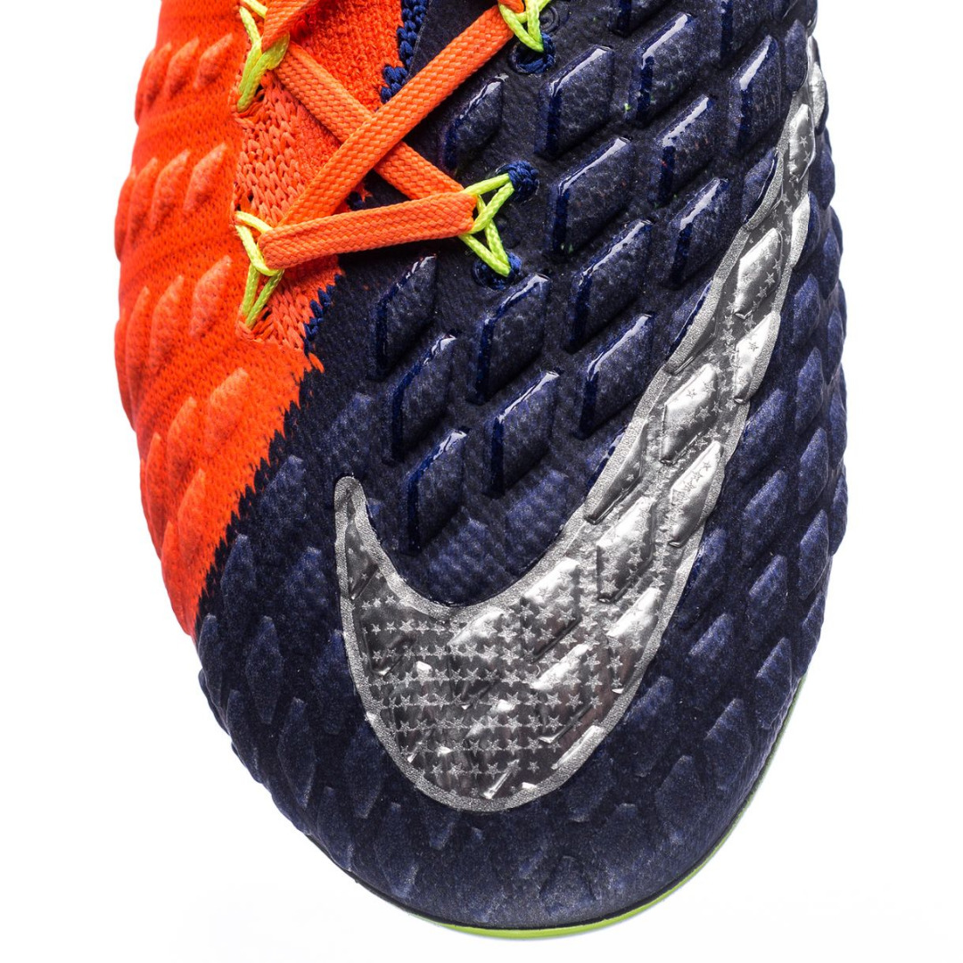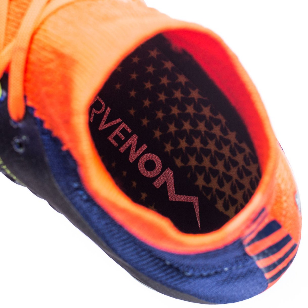 Футбольные бутсы профессионального уровня NIKE HYPERVENOM PHANTOM III DF FG 905274-408 SR для сухих полей с натуральным, травяным газоном из коллекции Time to Shine. Модель представлена в обновленной красно-синей цветовой гамме, с акцентами серого и лимонного цветов. Данная модель завышенного силуэта с цельной конструкцией верха Tongue Less обладает плотной, анатомической посадкой за счет использования в производстве верха материала Flyknit, имеющего различную плотность плетения нитей, что позволяет получить не только комфортную и плотную посадку, но и отличную воздухопроницаемость, необходимую гибкость и прочность. Для придания стопе дополнительной устойчивости и стабильности используется внутренний каркас, созданный из нитей Flywire, которые проходят в материале верха от подошвы до линии шнуровки, плотно фиксируя и удерживая ногу, препятствуя ее проскальзыванию при движении. Кроме того такое строение верха бутс позволяет снизить их вес и придать конструкции дополнительную прочность и надежность. Дополнительную фиксацию и поддержку ноги в голеностопном суставе создает завышенный ворот Dynamic Fit Collar, который обладает великолепной эластичностью. Обработанный по технологии All Conditions Control, материал верха дает игроку непревзойденный контроль над мячом независимо от погодных условий, в которых проходит игра. Поверхность бутс имеет объемную структуру HyperReactive, которая создана с использованием интегрированной в материал верха пеной Poron, что обеспечивает не только великолепное ощущение мяча при касании, но и позволяет смягчить его прием и увеличить силу удара. Смещенная от центра шнуровка увеличивает зону удара. Внутренняя стелька с системой Nike Grip исключает любое смещение стопы внутри бутсы, способствуя более эффективной передаче усилия при движении. Супинатор HyperReactive Plate, расположенный в подошве, увеличивает ее гибкость и отзывчивость. Гибридная подошва выполнена в передней части из гибкого эластомера Pebax. Задняя часть подошвы производится из жесткого нейлона и обеспечивает оптимальную поддержку. Для создания хорошей тяги и отличного сцепления на подошве имеются шипы, конфигурация и расположение которых подобраны методом компьютерного анализа Finite Element Analysis.